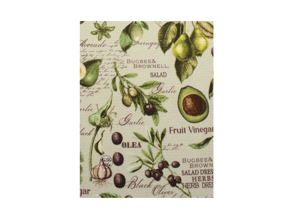 Vaflová útěrka ze 100% bavlny z jedné strany - se vzorem oliv, fíků, avokáda a dalších plodů, z druhé strany - bílá vaflovina.