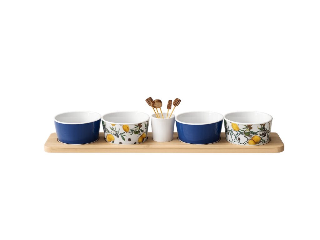 Každá miska nabízí dostatek prostoru pro servírování různých druhů pochutin – od oříšků, oliv, chipsů a dipů až po drobné sladkosti nebo omáčky. Součástí je pevný dřevěný podnos, který usnadňuje přenášení a zároveň zajišťuje přehledné a elegantní uspořádání na stole. Praktický tvar misek umožňuje pohodlné používání i snadnou údržbu.