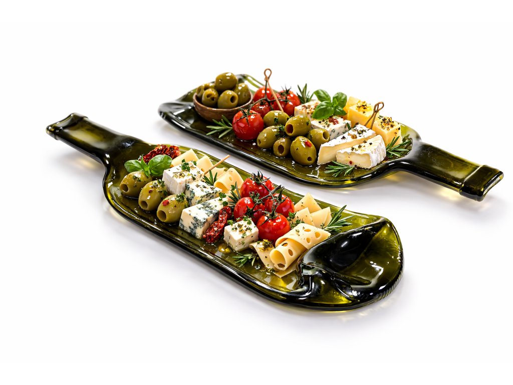 Originální skleněná miska ve tvaru lahve v elegantním olivově zeleném odstínu. Stylový doplněk pro servírování oliv, tapas, oříšků nebo drobných pochutin, který dodá stolování jedinečný charakter.